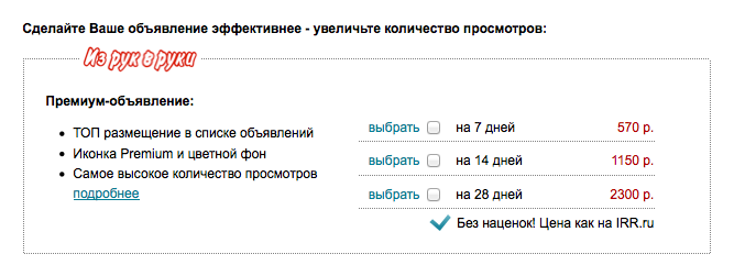 Заказать премиум-объявление и узнать стоимость для конкретного объявления (стоимость у Из рук в руки зависит от региона и тематики) можно на шаге выбора тарифного плана по заказу (при продлении или оплате нового заказа):