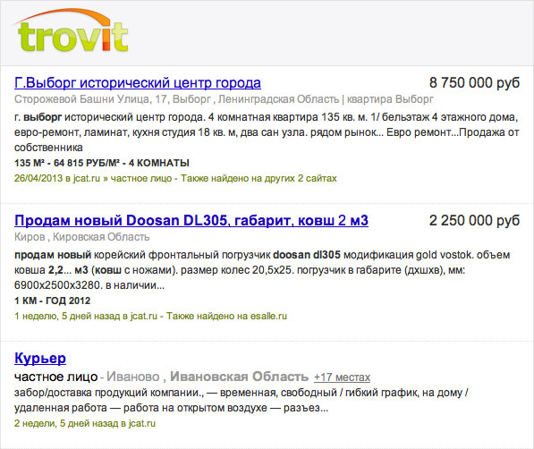 Trovit - поисковая система по объявлениям по недвижимости, автомобилям и работе. Запущенная изначально в Европе и в Латинской Америке, теперь работает и привлекает продавцов и покупателей в России. На площадке запущено размещение как объектов недвижимости, так и объявлений о продаже авто и конечно же вакансий!