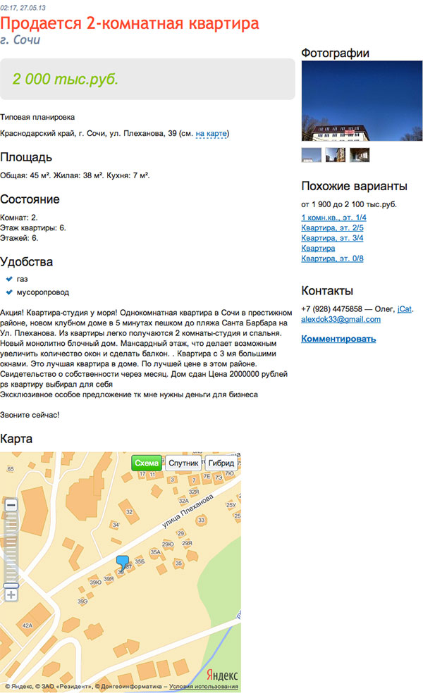 Пример объявления на портале: